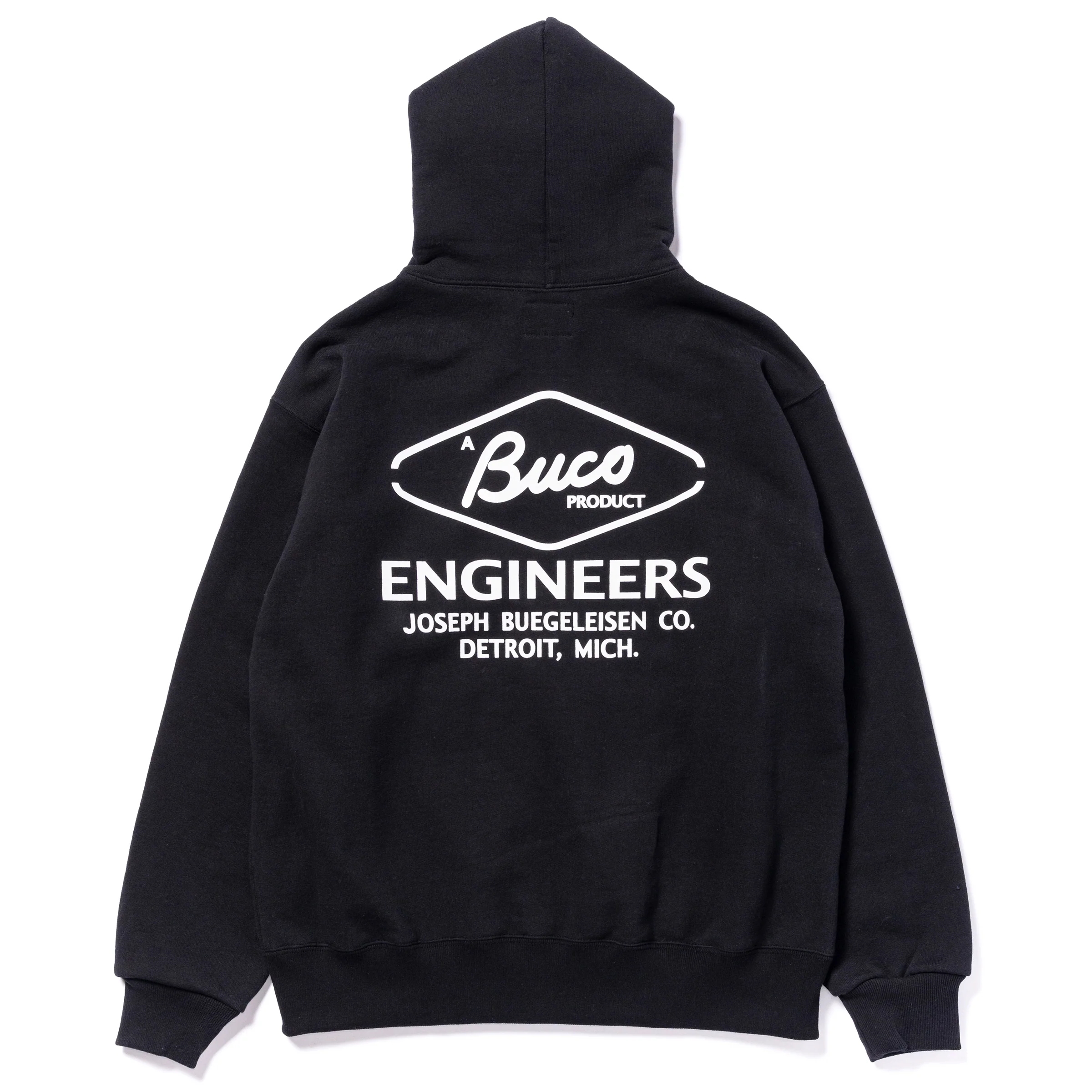 The BUCO F/Z PARKA SWEATSHIRT features tonal logo embroidery on the hood, a BUCO ENGINEERS motif on the chest and back, rubber-printed by hand in our Kobe-based factory, and BUCO-branded drawstring aglets.
