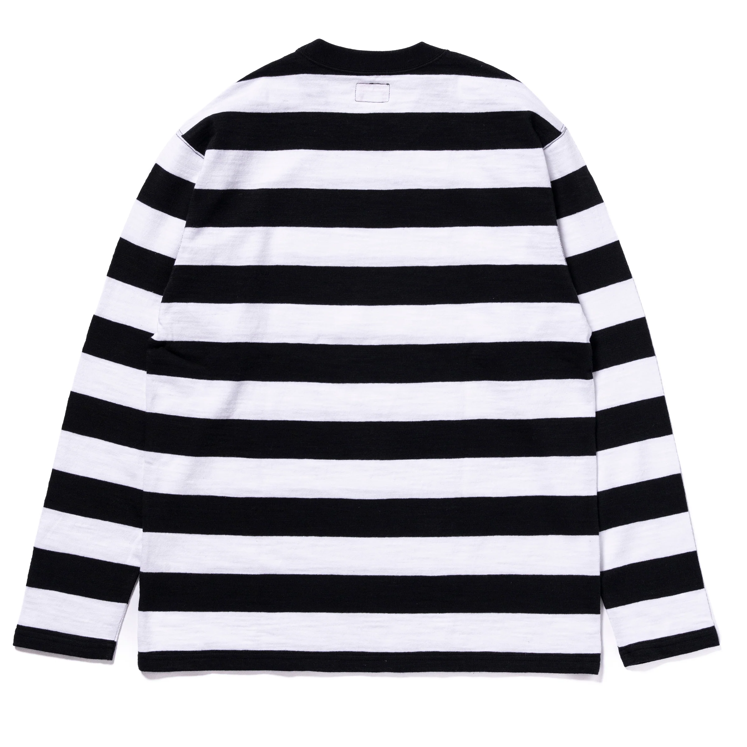 The thick two-tone stripe tee is synonymous with the outlaw biker scene of the 1950s. Aesthetically reminiscent of prison stripes, club members adopted thick two-tone stripe jerseys, often worn under biker ‘cuts,’ as a counter-culture rejection of the dapper style of pre-war motorcycle meet-ups. For many veterans, motorcycling emerged as a substitute for wartime experiences, and the act of men socializing post-war was in itself an anti-establishment concept. This, combined with the more casual, rugged aesthetic of men returning from the war in Europe, redefined the prevailing style of American motorcycle club members, especially in the ‘outlaw’ clubs on the fringes of biker culture.