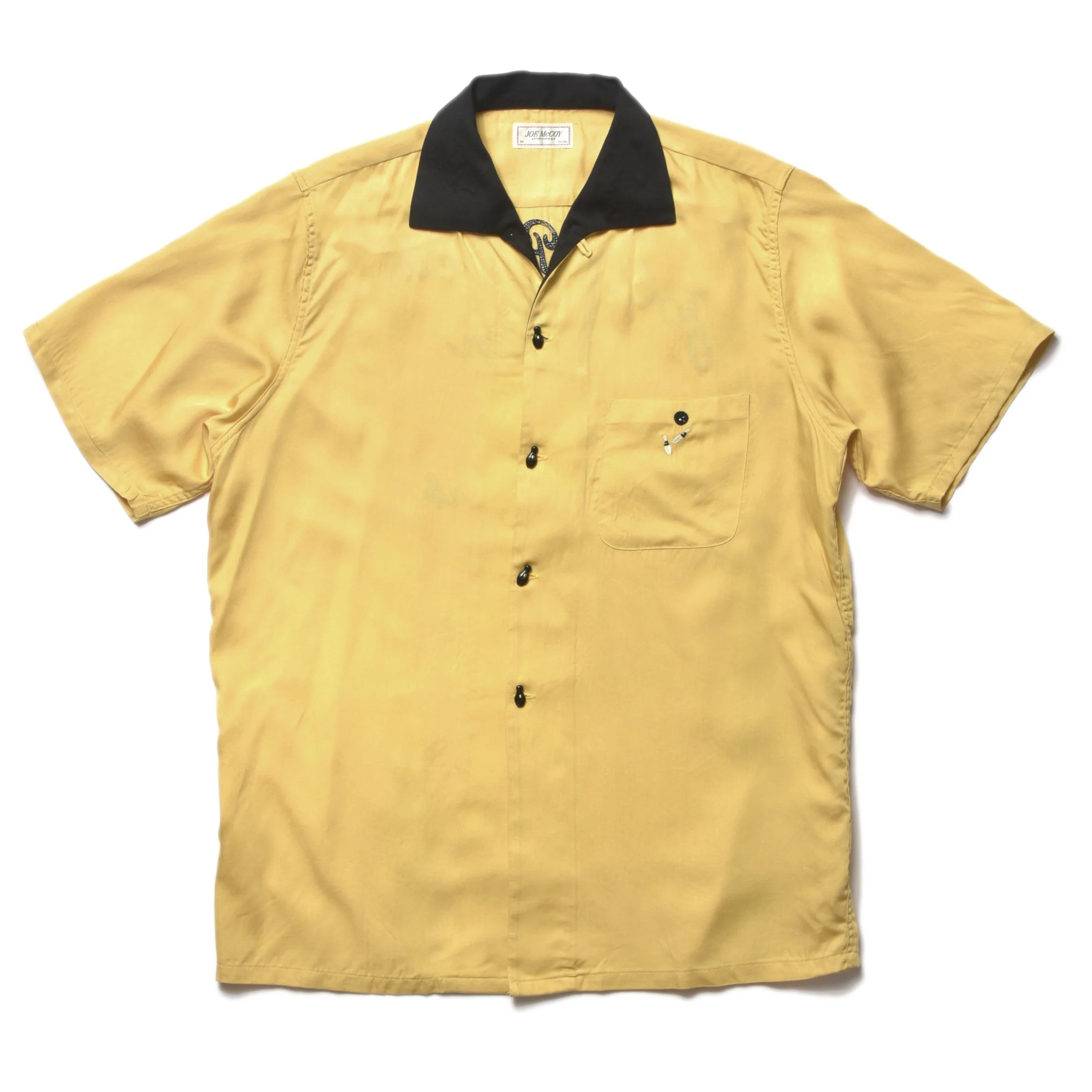 From Joe McCoy Sportswear, the RAYON BOWLING SHIRT / JOLLY ROGER celebrates the style and creativity of bowling shirts seen across alleys in 1950s USA. This model has been faithfully reproduced with a specially manufactured rayon cloth to achieve the relaxed drape commonly seen in bowling team archive images from the 50s, a finish achievable only with a fabric as dense as our bespoke designed Rayon which has been improved from the type used in the 50s to control shrinkage.